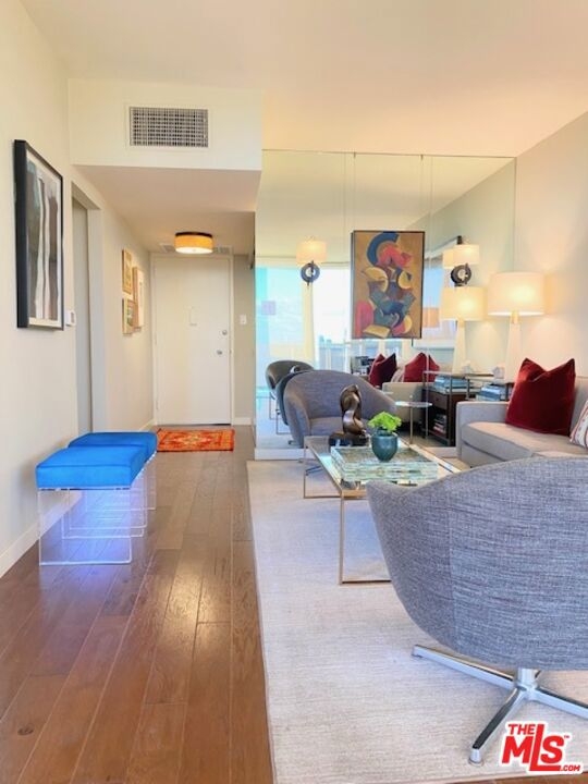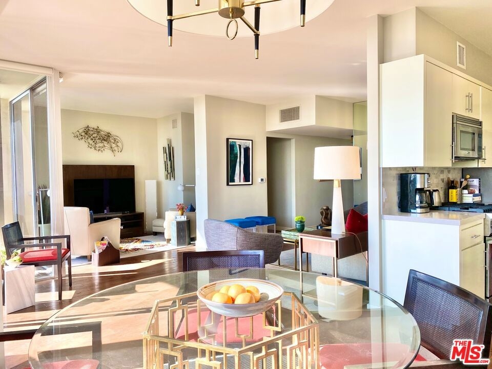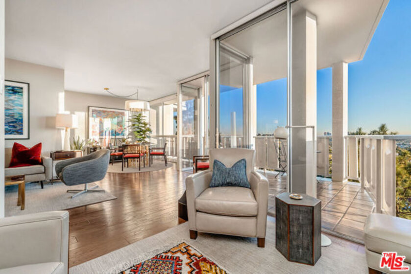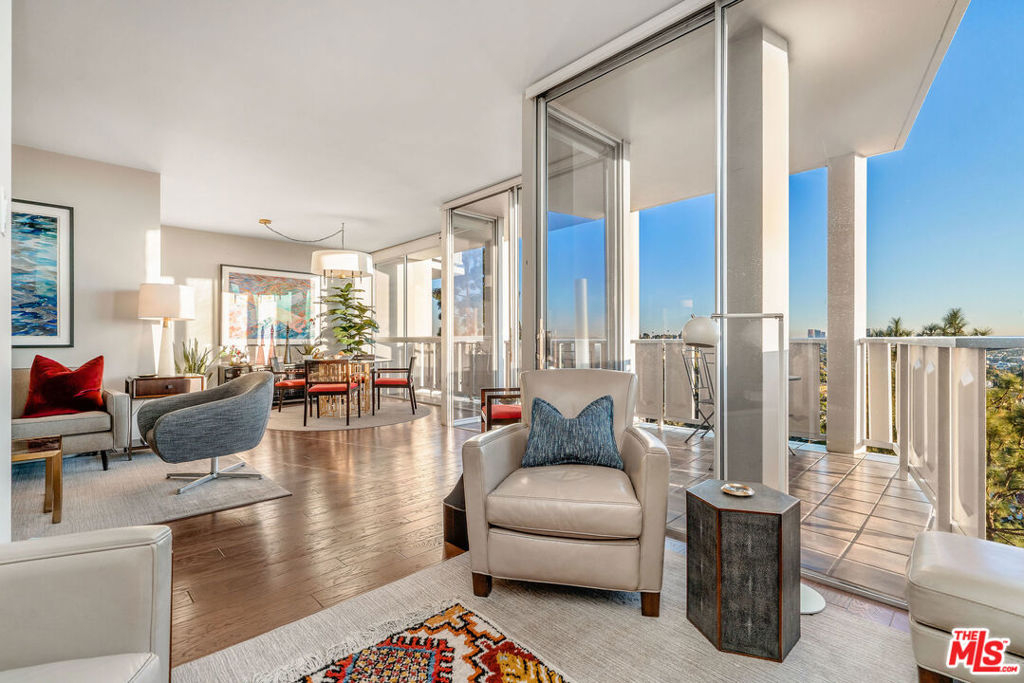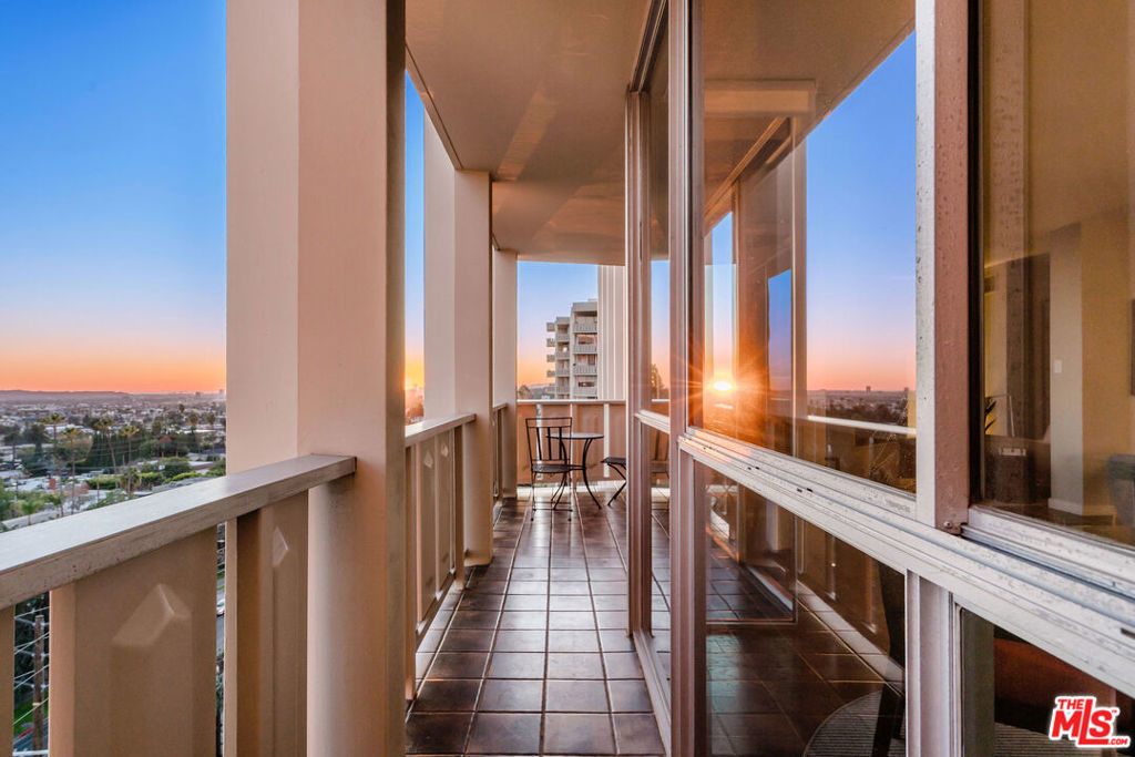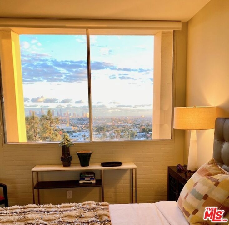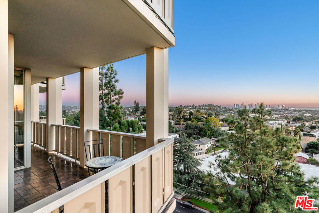Everything you need--in one smart, stylish package! Turnkey 1 bed/1bath Mid-Century condo set high above the fray, with drop-dead views of DTLA that beckon to you upon entering. Wide private terrace offers a birds-eye look at your surroundings--majestic tree canopies expanding outward to capture stunning #nofilter sunsets. Warm walnut plank flooring unifies the open and airy layout. Custom sun shades allow you to curate the views--and exposure--as you see fit. So close to Little Doms and All Time that you may vow to never cook again; and yet, should you be tempted, a bright, open galley chef's kitchen with a suite of Viking appliances awaits your touch. Renovated bath with walk-in shower and stylish oak vanities. Views and more views from the bedroom, which features a mirrored wall of smartly outfitted closet storage. Suite of amenities includes doorman plus security, heated pool & separate spa set on a beautifully landscaped open and sunny plaza. Magic hour never looked so good!