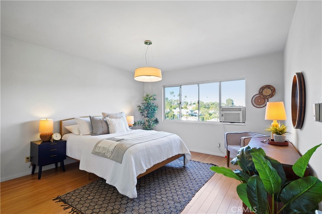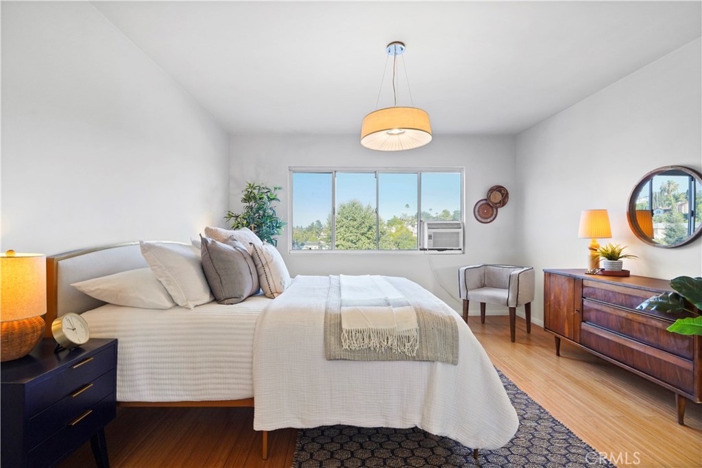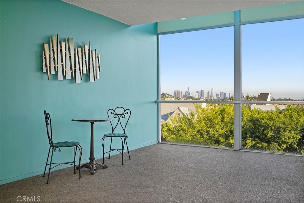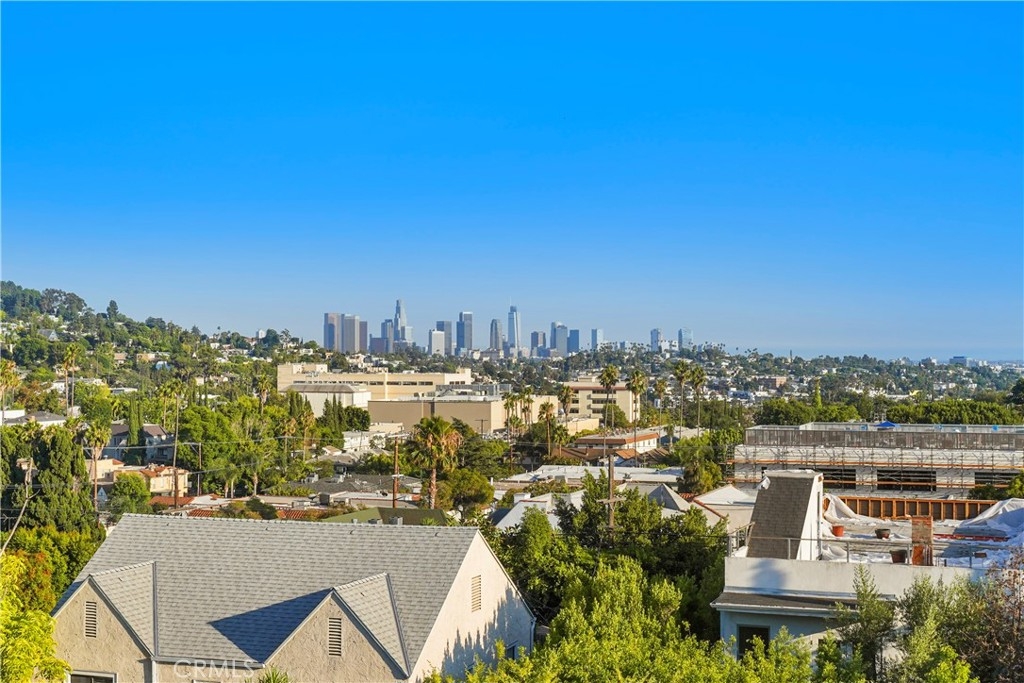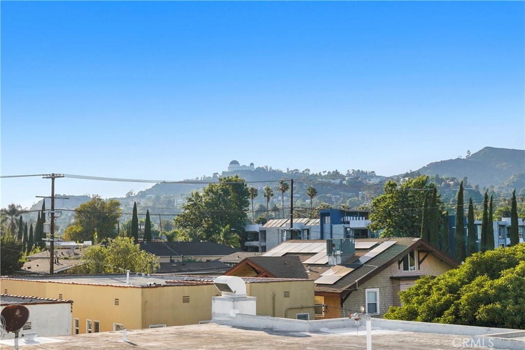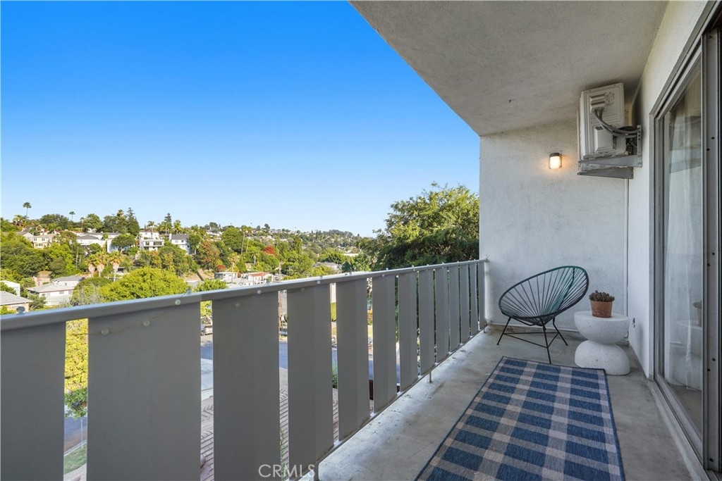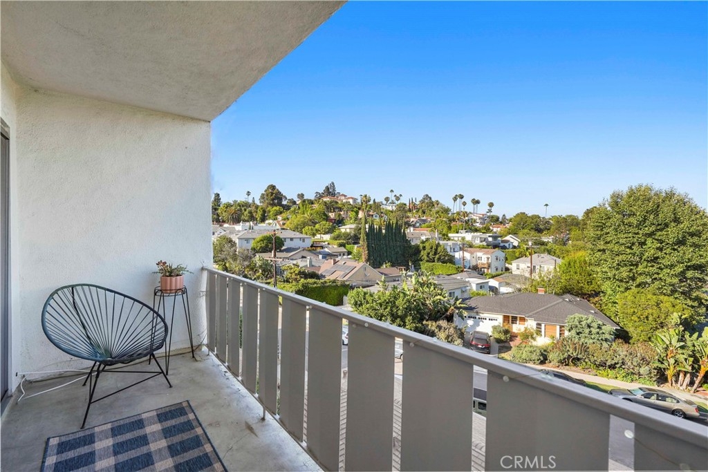 Poised on the top floor of a coveted Los Feliz complex, this stunning 2-bedroom, 2-bath mid-century gem is a rare offering that blends iconic design with modern sophistication—all set against a backdrop of sweeping hillside views and a peek of the Downtown LA skyline. Sunlight pours through expansive windows, highlighting generous living spaces that are both serene and beautifully functional. The oversized living room flows seamlessly to the largest balcony in the building, offering a perfect indoor-outdoor connection for morning coffee, alfresco dining, or simply taking in the view. The incredible views continue through the well sized bedrooms, where you will find ample storage and larger closet spaces. The thoughtfully restored pocket doors offer versatility in the formal dining room—easily transformed into a creative studio, home office, or guest space. A light-filled chef’s kitchen features abundant cabinetry, a breakfast nook, and newer appliances, making it as practical as it is charming. Smart upgrades abound: a Lutron whole-home lighting system with dimmers, ceiling fans throughout, and a newer mini-split system complement the home's breezy layout and cross-ventilation. Every detail has been considered for effortless everyday living. Retreat to a tranquil primary suite with spa-level finishes including Porcelanosa tile and bold zebra-striped marble countertops. The second bath is equally refined, with Carrera marble, slate tile, and thoughtfully designed storage. With a convenient underground parking space right across from the elevator and included basement storage area, this home provides many conveniences that make it the perfect pied-a-terre. Located in the vibrant heart of Los Feliz, this home places you just moments from top rated Franklin Hill Elementary, Griffith Park, top-rated restaurants, charming cafes, and everyday essentials—with outstanding walkability and easy access to all corners of the city. A true mid-century classic reimagined for today.