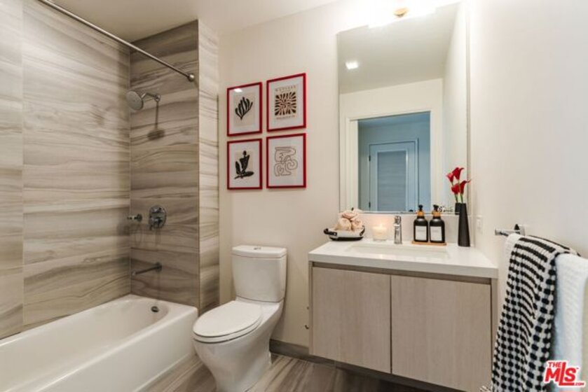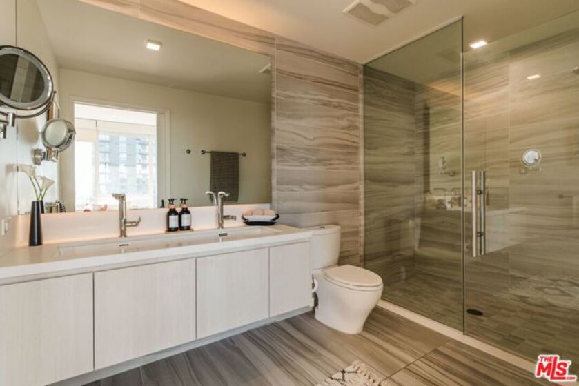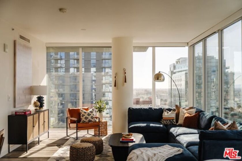 Positioned on the coveted southwest corner of TEN50LA, Residence 1901 sits within the building's most sought-after corner stack, offering sweeping, unobstructed views of the Downtown skyline, the Hollywood Hills, and even the iconic Hollywood Sign. Floor-to-ceiling glass walls place the skyline front and center, filling the home with natural light from morning to sunset. The open-concept layout is designed for both everyday living and easy entertaining, with generous living and dining areas centered around a chef's kitchen featuring Domus & Domus Italian cabinetry, a Bertazzoni cooktop, Liebherr refrigerator, Bosch panelized dishwasher, stainless-steel oven, and a Carrara marble waterfall island. Both the primary and guest bedrooms enjoy impressive city views, enhancing the sense of openness and light throughout the home. The primary suite offers a calm retreat with automated blackout shades, a spacious walk-in closet, and a spa-inspired bath with dual vanities and refined finishes. Privately positioned on the opposite side of the residence, the secondary bedroom provides excellent separation and includes its own full bathroom, making it ideal for guests or a home office. TEN50LA residents enjoy a full range of amenities including 24-hour concierge and security, a resort-style pool and spa, fitness center with Peloton bikes, private theater, business lounge, and resident entertaining spaces. Two dedicated parking spaces complete the offering. Located in the heart of South Park, just moments from LA Live, Crypto.com Arena, and some of Downtown's best dining and entertainment, this residence offers elevated city living in one of DTLA's premier full-service buildings.