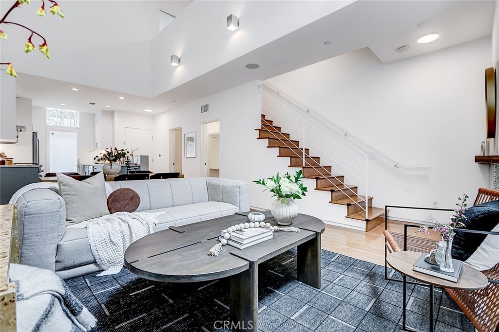 Live the quintessential LA lifestyle in this exceptional 2 bedroom, 3 bathroom contemporary Hollywood townhome. Special architectural features include an open floorplan with soaring 18 foot ceilings, massive white art walls, floor to ceiling windows, hardwood floors, Terrazzo fireplace, remodeled kitchen with custom cabinets & high-end appliances, and remodeled bathrooms including a stunning primary ensuite! The primary bedroom is spacious, full of light, featuring a walk-in closet and ensuite double-sink bathroom with custom shower. Other features include organized California Closets throughout the home, a secondary bedroom with ensuite bathroom and walk-in closet, 4th floor loft flex space, and a private rooftop deck with views of the Hollywood Hills and Griffith Observatory! There is an additional large storage closet on the deck for seasonal furniture, decorations or extra equipment. This townhome is conveniently located near the Sunset Strip providing easy access to shops, restuarants, theaters, hiking, parks, nightlife, and music venues. The perfect Hollywood townhouse in the perfect Hollywood location - ready for its next act! Don't miss it.