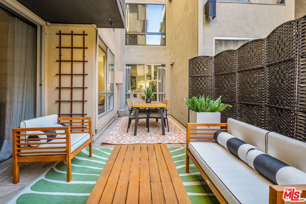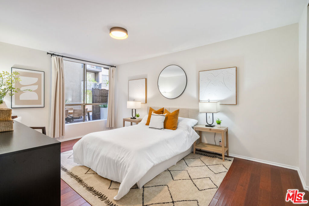 Welcome to the Briarwood, a hidden gem tucked just off the iconic Sunset Strip in the heart of Hollywood Hills West. This spacious 2-bedroom, 2-bath condo spans 1,129 square feet. Step inside to discover an inviting layout with hardwood floors throughout and a living room that seamlessly extends onto a private, generously sized patio. This outdoor oasis stretches along the entire rear of the unit, offering a peaceful retreat with a courtyard ambiance that ensures a sense of seclusion. Freshly painted and updated with some modern light fixtures, this condo home is equipped with central air & heat, and a cozy living room gas fireplace. The large primary bedroom features ample closet space with custom cabinetry and ensuite bathroom with a dual vanity and nicely tiled shower. Meanwhile, the second bedroom is equally inviting, and both rooms have large windows facing the patio adorned with curtains. Another bathroom with shower over tub sits at the end of the hallway for house guests. Unit #104 is conveniently located just off the lobby for easy access, yet enjoys one of the best spots in the building. The Briarwood offers residents a refreshed lobby, a sparkling pool and jacuzzi perfect for soaking up the sun or enjoying an evening under the stars, a sauna, and two assigned tandem parking spaces! A community laundry area, including a washer and dryer just across the hall, makes daily chores a breeze. Nestled on a quiet, tree-lined street dotted with palm trees, this condo is a peaceful haven just moments from Runyon Canyon hiking trails and the 101 Freeway. You'll have the best of Los Angeles at your fingertips - an urban retreat that's still close to everything!