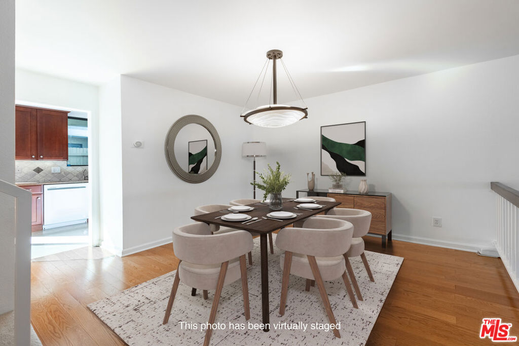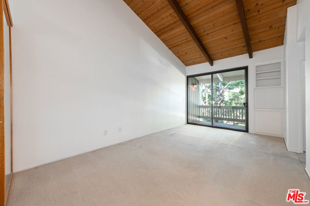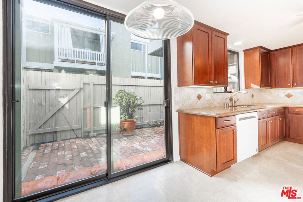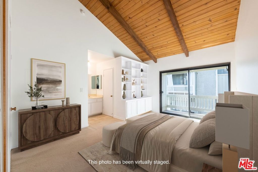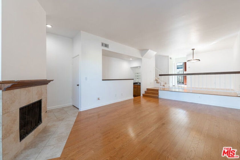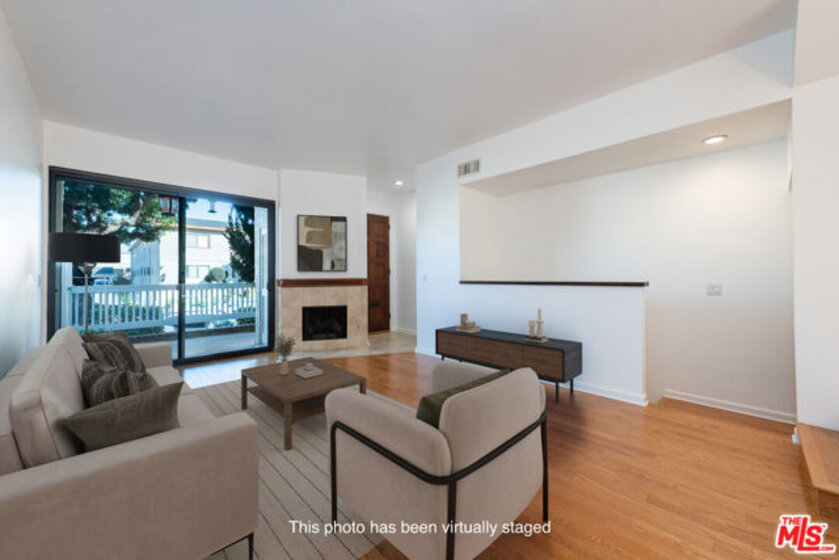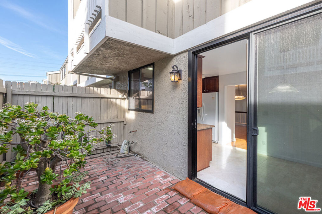 This beautiful townhome offers an ideal location for entertaining with a West LA lifestyle. A private entrance and spacious front patio opens into a dramatic split-level main living space featuring high ceilings, gleaming hardwood floors, and a formal dining room with adjacent wet bar. The eat-in chef's kitchen enjoys granite countertops, tile backsplash, a double sink, and generous cabinetry. Sliding glass doors connect the kitchen to a bricked back patio, perfect for indoor-outdoor entertaining. Upstairs, the expansive primary suite showcases soaring wood-beamed cathedral ceilings, attached bath with dual sinks, and a private balcony overlooking mature trees, offering a serene retreat. Across the hall, a secondary suite includes a built-in bookcase, ensuite bathroom, and another private balcony. A large bonus room with in-unit laundry could serve as a home office, gym, or media room with direct access to the parking garage. Ideally located in sought-after West LA, the home offers convenient access to dining, shopping, entertainment, major freeways, and the beach.