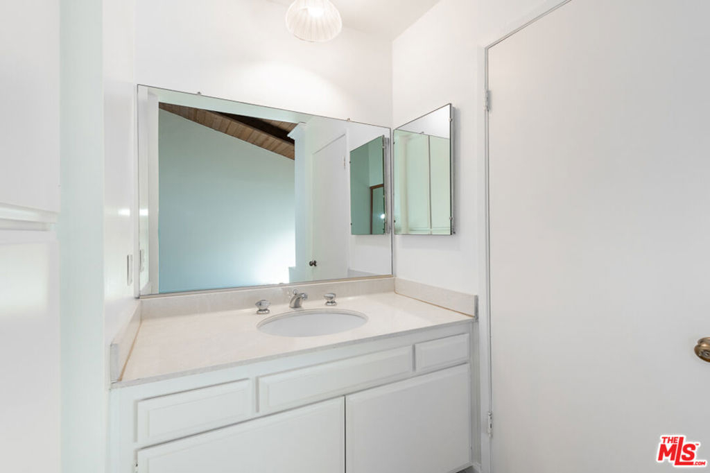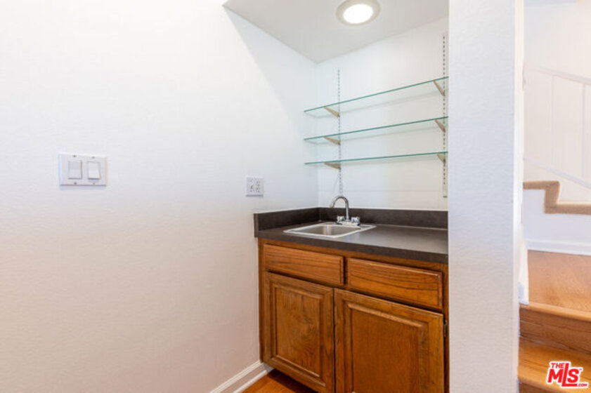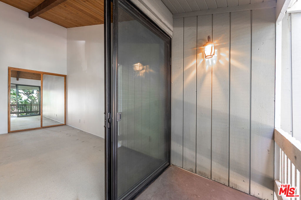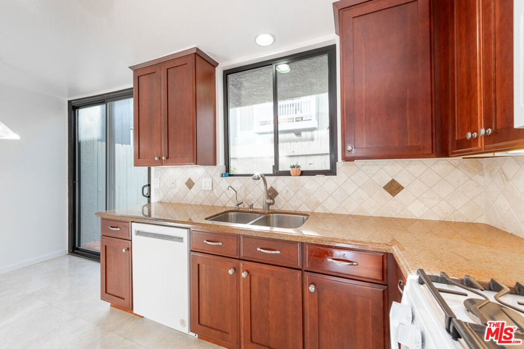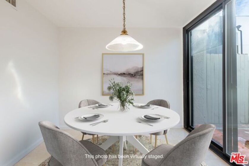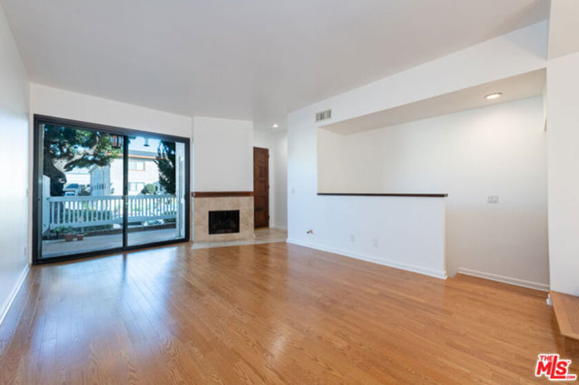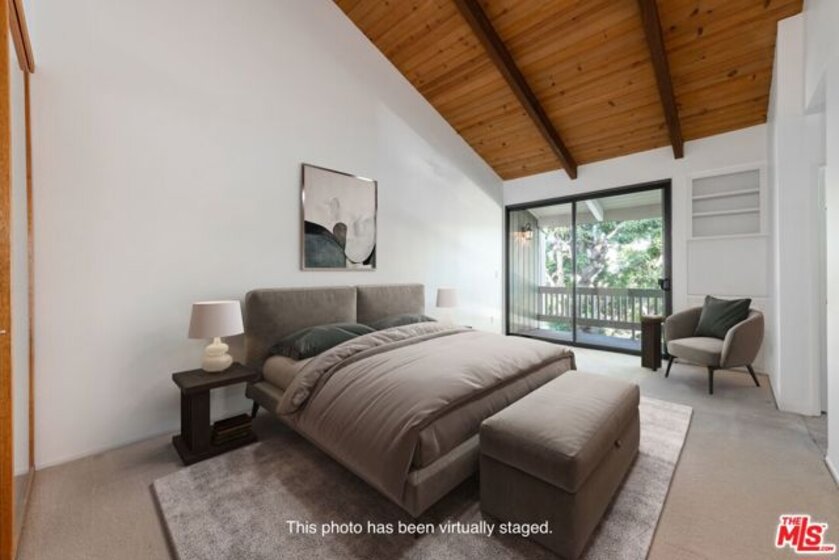 This beautiful townhome offers an ideal location for entertaining with a West LA lifestyle. A private entrance and spacious front patio opens into a dramatic split-level main living space featuring high ceilings, gleaming hardwood floors, and a formal dining room with adjacent wet bar. The eat-in chef's kitchen enjoys granite countertops, tile backsplash, a double sink, and generous cabinetry. Sliding glass doors connect the kitchen to a bricked back patio, perfect for indoor-outdoor entertaining. Upstairs, the expansive primary suite showcases soaring wood-beamed cathedral ceilings, attached bath with dual sinks, and a private balcony overlooking mature trees, offering a serene retreat. Across the hall, a secondary suite includes a built-in bookcase, ensuite bathroom, and another private balcony. A large bonus room with in-unit laundry could serve as a home office, gym, or media room with direct access to the parking garage. Ideally located in sought-after West LA, the home offers convenient access to dining, shopping, entertainment, major freeways, and the beach.