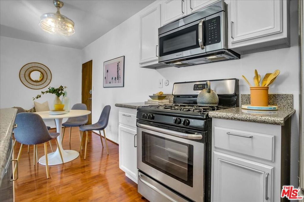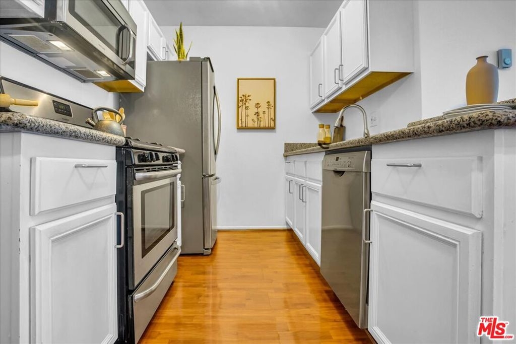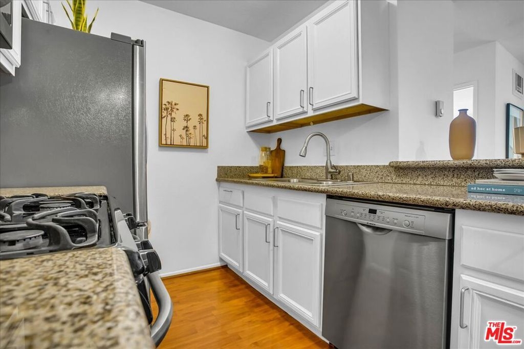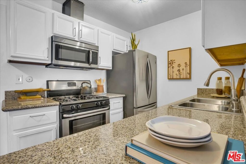 Light and bright two bedroom two bath one level condo on upper floor. Open floorplan, with efficient layout - bedrooms on either side of the unit for added privacy. Each bedroom has it's own adjacent bathroom. Newer double pane window -A/C in-wall unit, special ceiling fans in each room with retractable blades when not in use. Wide plank, mahogany simulated vinyl flooring in all rooms, large hall closet - front entry closet - double closets in primary suite. Stainless steel appliances, new Bosch dishwasher -granite counter tops. Living room faces the sparkling pool with sliding doors to a lengthy patio- Security building - gated community garage -2 car parking (tandem), good curb appeal building and well lite - newer carpeted wide hallways. Great condominium location on a beautiful tree-lined street in a convenient, popular area, close to shopping and many restaurants. Best value/priced 2 bedroom 2 bath condominium in this area!