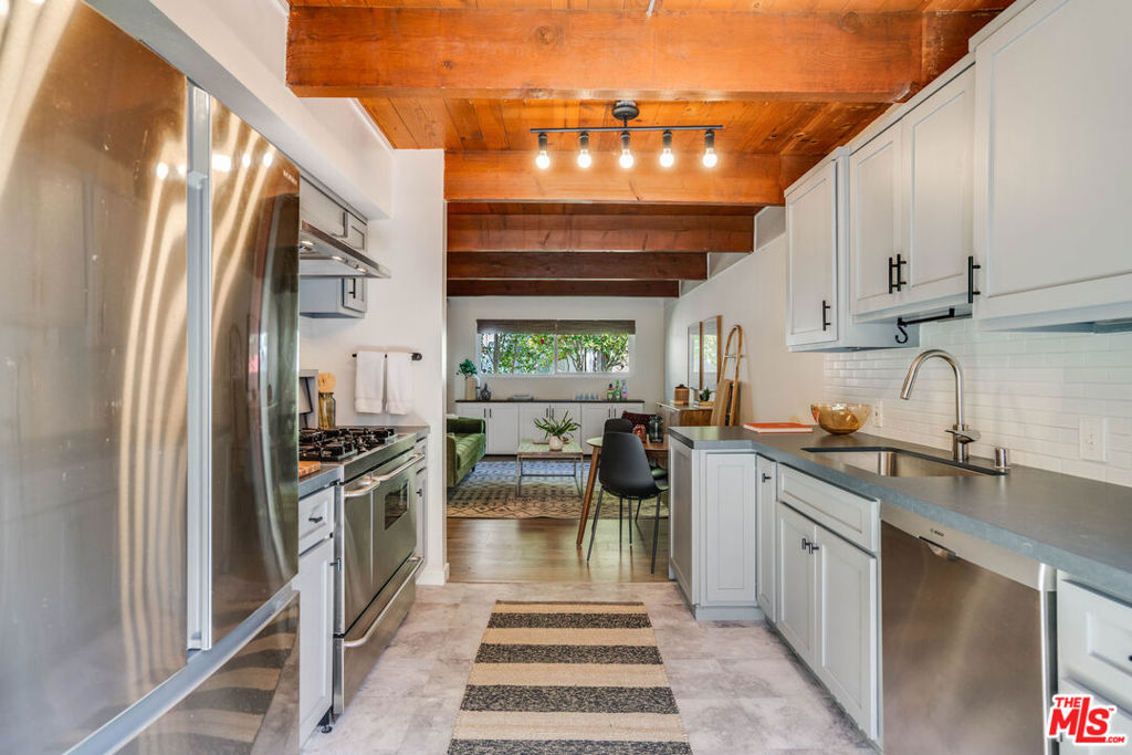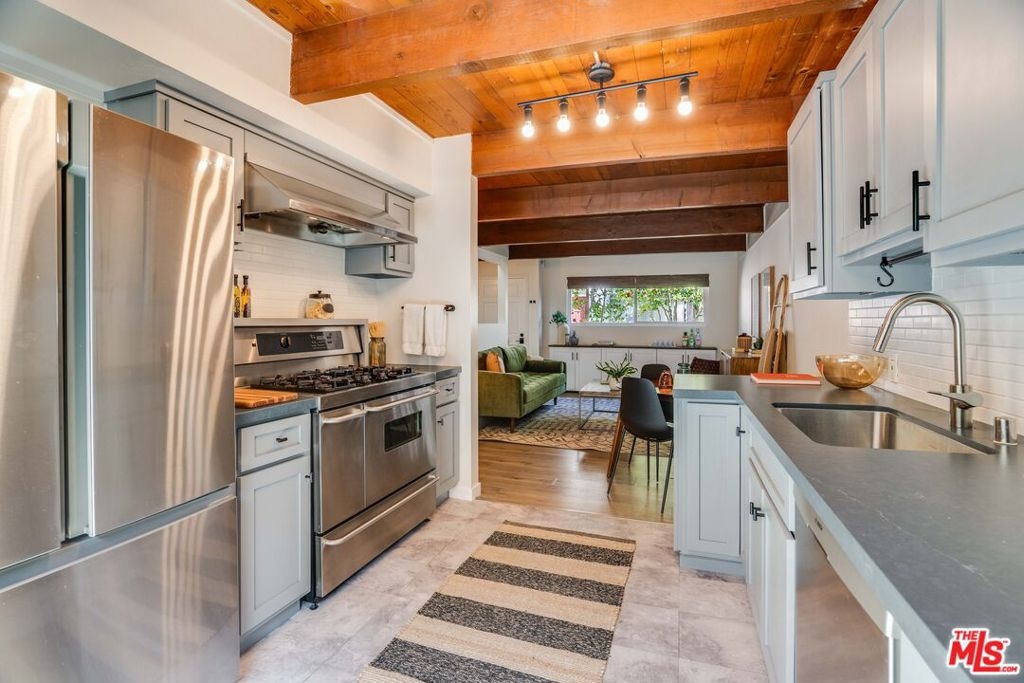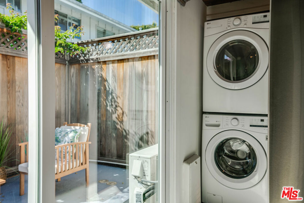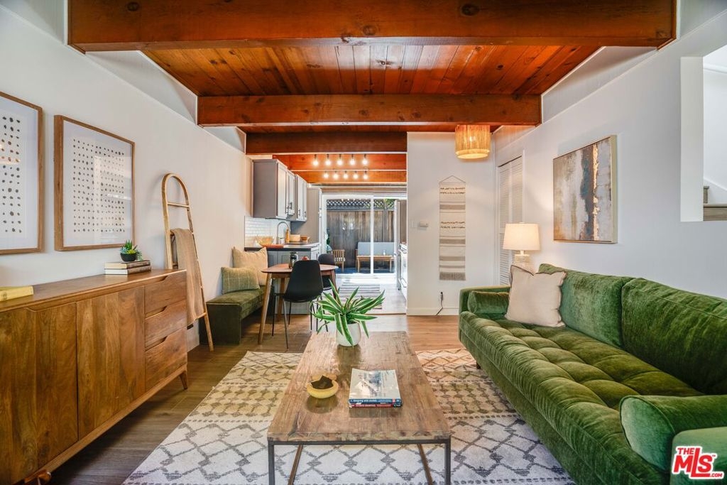 Welcome to this clean, remodeled, and gated townhouse in central Mar Vista. Step inside and you'll immediately notice the beautiful wood beamed ceilings and laminate flooring throughout, drawing you to the open concept Living/Kitchen/Patio. Updated kitchen with quartz countertops, updated lighting, and newer appliances (refrigerator, washer/dryer, dishwasher). Large open patio - perfect for relaxing, gardening, and al-fresco dining. There is a stylish half bath, storage shelves, and a stacked laundry area just off the kitchen. Upstairs there are two bedrooms and a full bath. Both bedrooms feature dramatic vaulted wood-lined ceilings with ample closet space in each room. All new within the last 5 years: Vinyl patio sliding door, AC mini split upstairs, Hunter Douglas roller shades, and updated sinks/toilets/vanities in both bathrooms. The lush gated grounds include a sparkling clean community pool and spa. This unit has its own parking spot located not too far from the unit. New roof and skylight in 2019. Close to the beach, shops, eateries, and everything else the Westside has to offer.