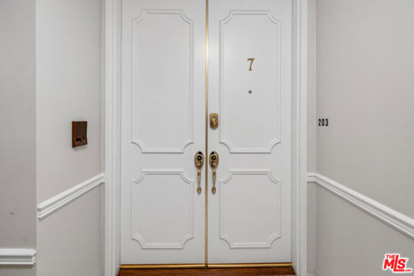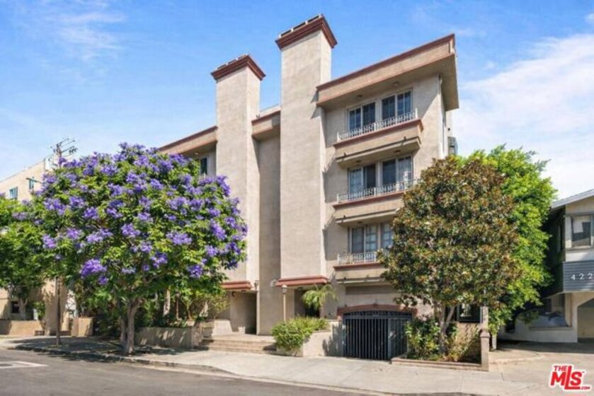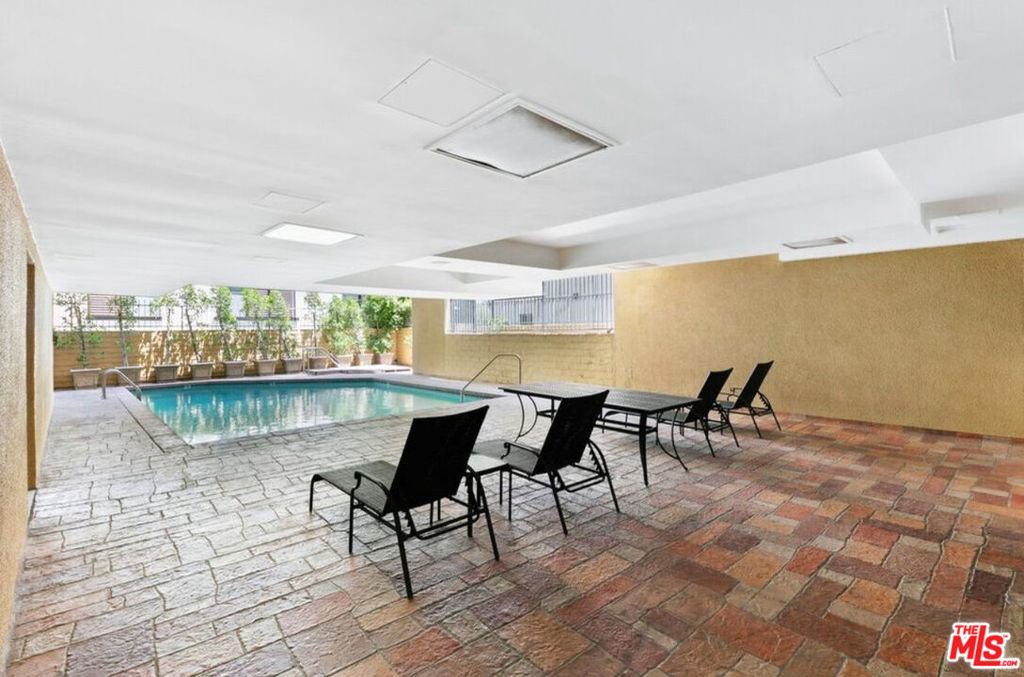BEAUTIFULLY RENOVATED CORNER CONDOMINIUM JUST STEPS FROM BEVERLY HILLS. You arrive on a quiet, tree lined street just one block east of Robertson Boulevard, where cafes, fine dining, and boutique shopping are immediately accessible. A secure Mediterranean style boutique building with a spacious lobby and just twelve residences creates a rare sense of privacy and calm. Step inside this corner two-bedroom, two-bathroom luxury condominium and natural light fills the space, showcasing a thoughtfully designed 1,250 square foot floor plan. The living room is both refined and inviting, anchored by a gas fireplace framed in Italian marble and custom built-in bookshelves. A built-in desk offers a seamless work from home space without compromising elegance. The dining room opens to a private balcony through expansive eight-foot sliding glass doors, surrounded by lush greenery for a rare sense of seclusion. It feels like an extension of the living space, perfect for morning coffee or evening wine. The cook's kitchen is stylish and functional, featuring white lacquer cabinetry, solid surface counters with marble backsplashes, stainless steel KitchenAid appliances, a tray ceiling, and an over sink bay window ideal for growing fresh herbs. The primary suite provides a serene retreat with an oversized walk-in closet and a beautifully finished bathroom with dual vanities and marble tile. The guest bedroom features dual closets and a guest bathroom finished to the same high standard. An in-unit washer and dryer add convenience, while custom blinds, drapes, window treatments, and crown molding reflect attention to detail throughout. Building amenities include a pool, recreation room, inviting lobby, and two assigned parking spaces. All are within walking distance to Beverly Hills luxury boutiques, fine dining, The Grove, the Beverly Center and Cedars Sinai. Can you imagine living this close to everything, yet feeling completely at home?