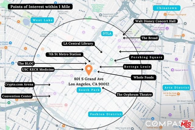 Sky Lofts is at the epicenter of DTLA in the South Park District. Perched high above the city on the 15th floor at 801 S Grand Ave, this 2-bedroom, 2-bathroom, 1,220 square foot loft-style condo offers a seamless blend of modern finishes, open-concept living, and exciting skyline views. This south facing unit has massive windows, letting natural light spill in to create an ideal backdrop for both day-to-day living and evening entertaining. 10 foot high ceilings add to the loft style vibes. The kitchen is open to the living room with a breakfast bar/island with plenty of storage and seating capability as well as a dining area between the kitchen and living room. Off of the living room there is primary bedroom suite with a spacious ensuite bathroom that includes a double vanity, a large tub and separate shower. Attached to the primary bathroom is a large closet. The 2nd bedroom, off the main entryway, is perfect as an office or guest bedroom and situated next to the 2nd full bathroom. There are light hardwood floors throughout the unit giving it a modern and bright tone. In addition, there is an in unit washer and dryer closet and central heat and air conditioning. The list of building amenities are impressive - a premium updated gym, a movie/media room with comfy theatre style seating, a clubhouse/entertainment room with a full kitchen that can be booked for events and a 24 hour security desk in the lobby. The unit includes two side by side parking spaces in the underground garage. There is a separate garage on site with ample visitor parking for guests. Nightlife, dining, entertainment and shopping are minutes away. Notable restaurants nearby like Bottega Louie, Water Grill, 71 Above and LeGrand. Across the street from Whole Foods and within 5 blocks from Crypto.com arena. If you're looking for a downtown city lifestyle with a walkable neighborhood and vibrant culture, then 801 Grand Ave is the place to be.