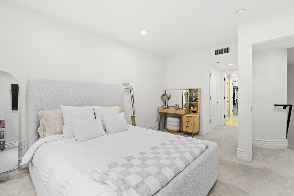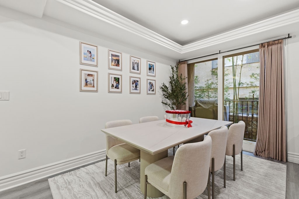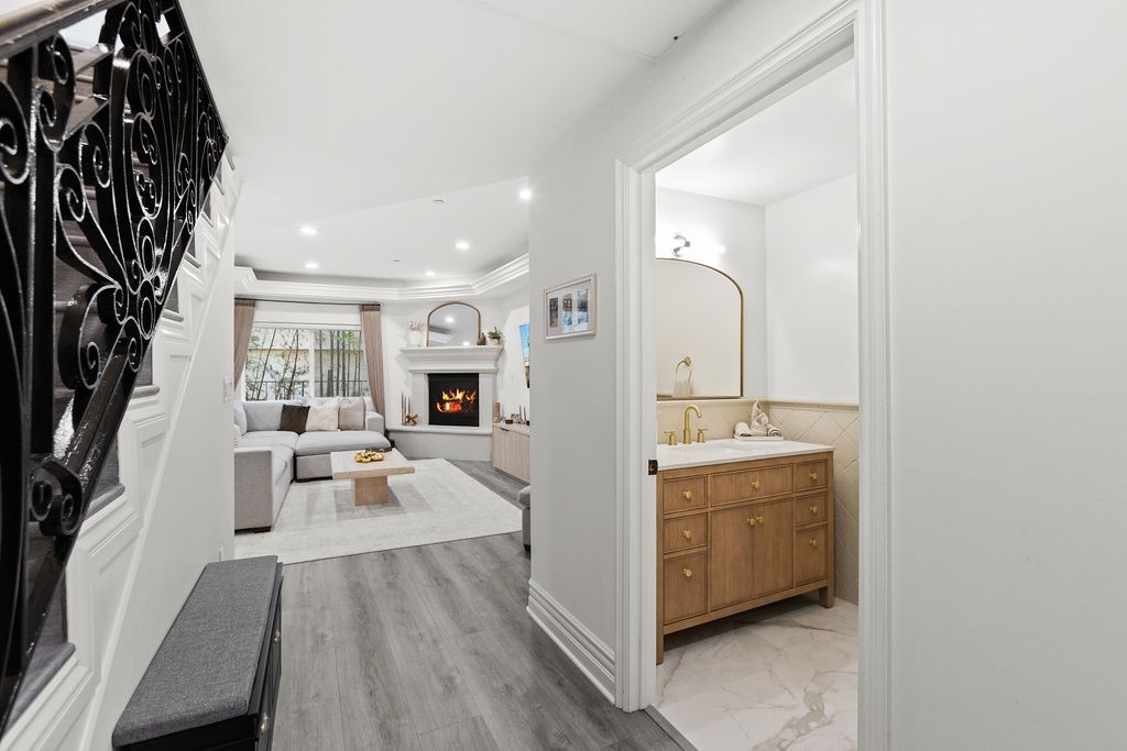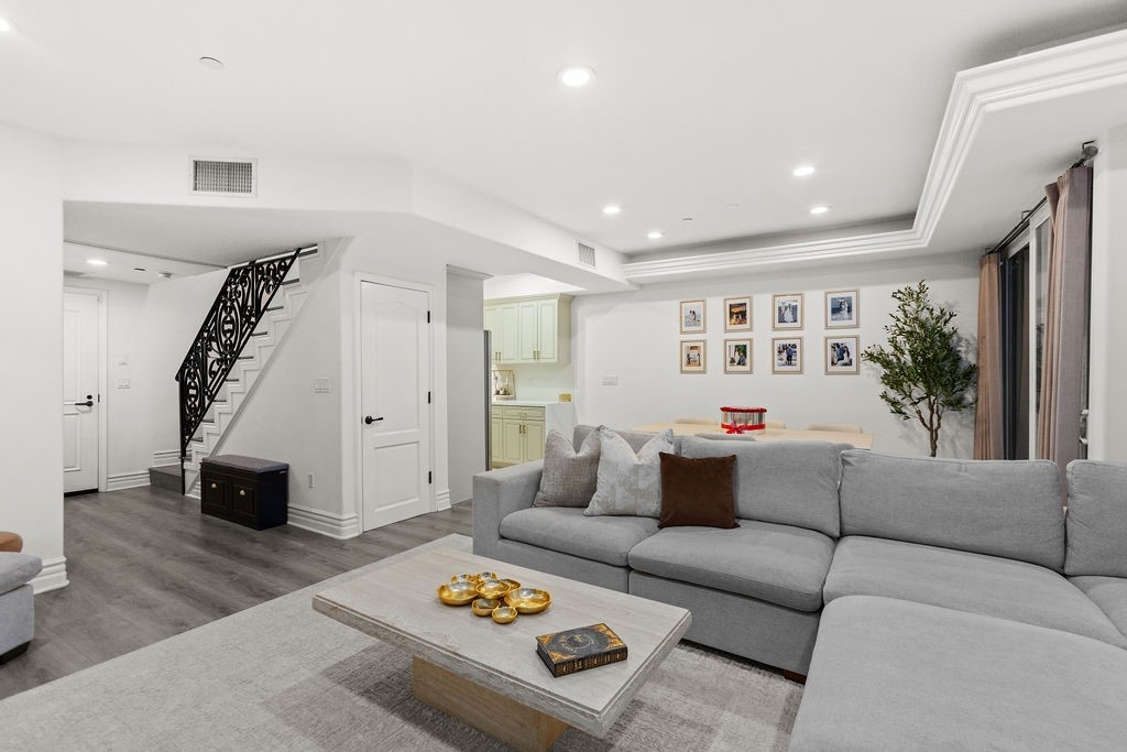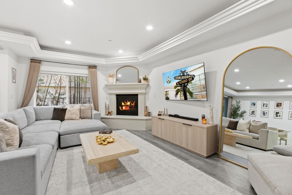 Experience refined living in this beautifully remodeled two bedroom, two-and-a-half bath "townhome style" residence, perfectly blending contemporary design with timeless sophistication. Thoughtfully designed, both bedrooms are located on the upper level, each featuring its own elegantly appointed en-suite bath, while a chic powder room on the main floor offers convenience for your guests. The remodeled gourmet kitchen showcases high-end Viking appliances, custom cabinetry + ample "Calacatta Style" quartz counter-tops with a waterfall edge. The kitchen flows seamlessly into the dining and living areas. The open-concept design is enhanced by custom crown molding, refined finishes, and a cozy gas-burning fireplace that anchors the living space with warmth and style. Additional amenities: central air conditioning; luxury vinyl flooring; stylish porcelain flooring in kitchen and powder room; stackable washer/dryer closet on 2nd floor; voice command lighting and window coverings; private balcony; exceptional closet space (2 walk-ins in primary bedroom) + additional mirrored wardrobe; spacious walk-in in guest bedroom; dual vanity in primary bedroom + soaker tub & separate shower; 2 secured/assigned tandem covered parking spaces & the list goes on... Centrally located near La Cienega’s famed Restaurant Row, The Beverly Center, The Grove, and more — this exceptional home combines modern living with unbeatable convenience.